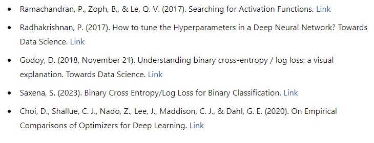 Binary Cross Entropy (Log Loss): This loss function was selected for its suitability and effectiveness in binary classification problems (Saxena, 2023). Binary Cross Entropy measures the error between predicted probabilities and actual class labels, providing a clear signal to improve the model during training. It works particularly well with the Sigmoid activation function, as Sigmoid outputs probabilities that Binary Cross Entropy can evaluate accurately (Ibrahim, 2023). This synergy between Binary Cross Entropy and Sigmoid helps optimize the model's performance in distinguishing between the two classes.