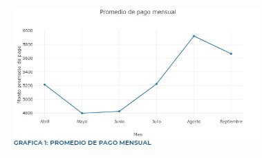 The line chart illustrates the average monthly payment amounts from April to September. Notably, there is a significant increase in the average payment amount in August, followed by a slight decrease in September. This trend indicates that customers tend to make higher payments towards the end of the observed period, possibly due to catching up on delayed payments or seasonal financial patterns.