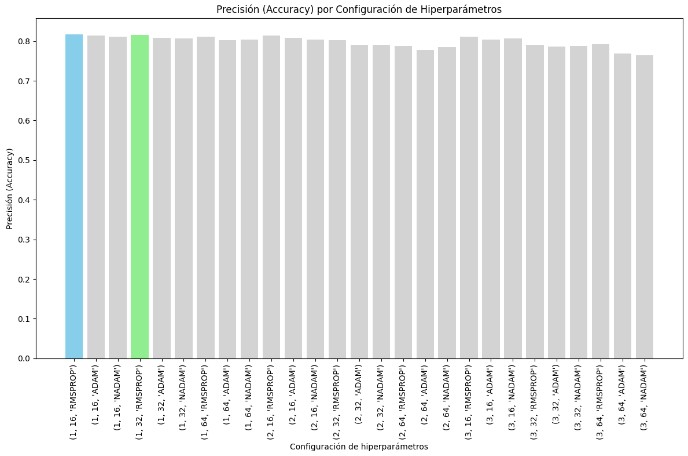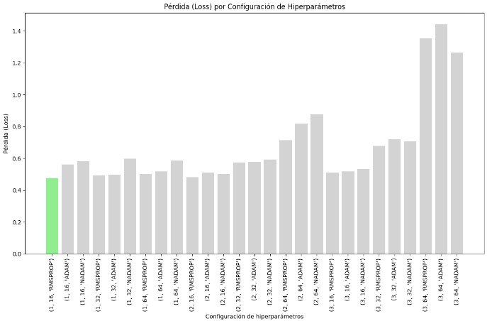 The configuration with 1 layer, 16 neurons, and the RMSPROP optimizer achieved the lowest loss, indicating it was the best at minimizing error during training. Also, performed well in terms of accuracy, confirming its effectiveness.