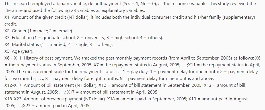 The data for this project was sourced from the University of California Irvine repository: Default of Credit Card Clients. The dataset includes 23 explanatory variables such as credit amount, gender, education, marital status, age, past payment history, bill statement amounts, and previous payment amounts.