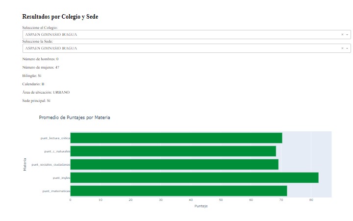 In the Results by School and Campus section, users can select the school and specific campus they are interested in. Once a selection is made, the interface displays detailed information about the selected school, including the number of male and female students, whether the school is bilingual, its calendar type, area of location (urban or rural), and whether it is the main campus. Additionally, a bar chart presents the average scores for each subject (Mathematics, English, Social Sciences, Natural Sciences, and Critical Reading) for the selected school and campus. This allows users to easily compare performance metrics across different subjects and campuses.
