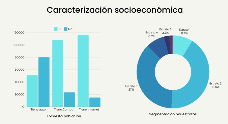 The second graph presents the segmentation of the population by socioeconomic strata. It illustrates that the majority of students belong to strata 2 and 3, accounting for 41.8% and 37% of the population, respectively.