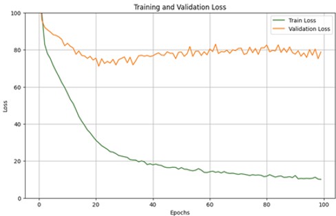 Data was split into 30% for testing, 21% for validation, and the remainder for training. The training set was used to fit model parameters, the validation set for hyperparameter tuning and performance evaluation, and the test set for final model evaluation.Also, the model was trained through 100 epochs.