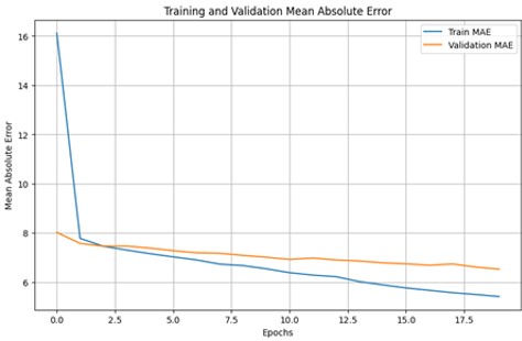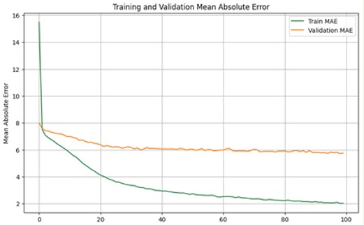 Mean Squared Error (MSE) was used as the loss function because it heavily penalizes large errors, encouraging the model to minimize significant discrepancies. Mean Absolute Error (MAE) was used as a metric for its intuitive interpretation of average error magnitude (Brownlee, 2020).
