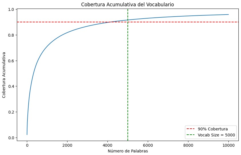 As the figure shows, using the top 5,000 words yields about 90% coverage of all tokens in the train subset. This greatly reduces the embedding dimension requirements while retaining the majority of relevant vocabulary.
